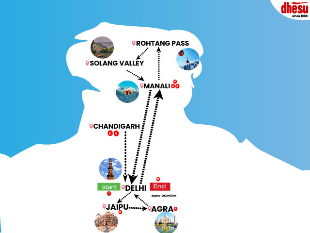 Manali is situated in the midst of the Himalayas, offering views of snow-capped mountains, green valleys, and meandering rivers. Manali has a rich cultural heritage with influences from Hinduism, Buddhism, and Tibetan culture. Visitors can explore ancient temples, monasteries, and traditional villages to experience the local way of life. Thereafter visit The Golden Triangle of India. Delhi (The Capital), Agra (City of the Taj) and Jaipur (Pink City of India) Explore the capital of Rajasthan, the Desert City of India. It evokes the royal family that once ruled the region and founded what is now called The Pink City. Jaipur is famous for its Ancient Stories, Palaces, Forts, Gemstones, traditional fabrics, handicrafts, and also for the traditional Rajasthani Cuisine.