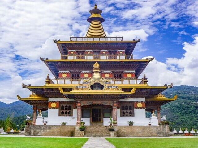 The majestic Khamsum Yulley Namgyal Chorten rises elegantly against a backdrop of rolling green hills and open sky. Built to promote peace and harmony, this intricately designed temple showcases Bhutan’s rich spiritual traditions and stunning craftsmanship, offering visitors a serene and uplifting experience.