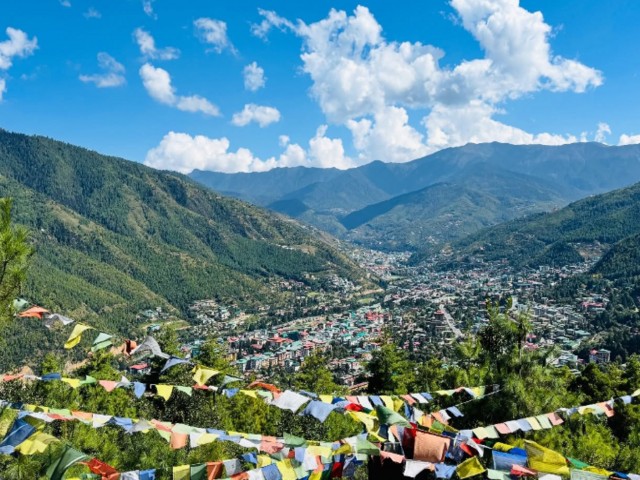➤ In the late afternoon, head to Sangaygang View Point (2,685 meters), where you can enjoy sweeping views of the entire Thimphu Valley. Surrounded by forested hills and adorned with hundreds of colorful prayer flags, this serene spot is especially magical at sunset.