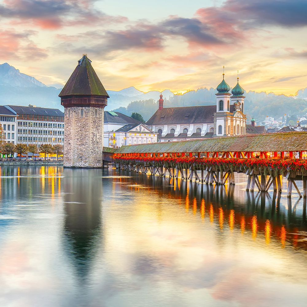 Lucerne’s Chapel Bridge is a historic wooden bridge adorned with charming paintings, spanning the Reuss River and symbolizing the city’s medieval heritage.