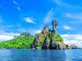 Next up is Chicken Island, which got its name because of a large rock formation that undoubtedly resembles the head and neck of a chicken. This island is unique as on one side there is sheer cliffs that are covered in vegetation, while the other side boasts a beautiful beach. |
